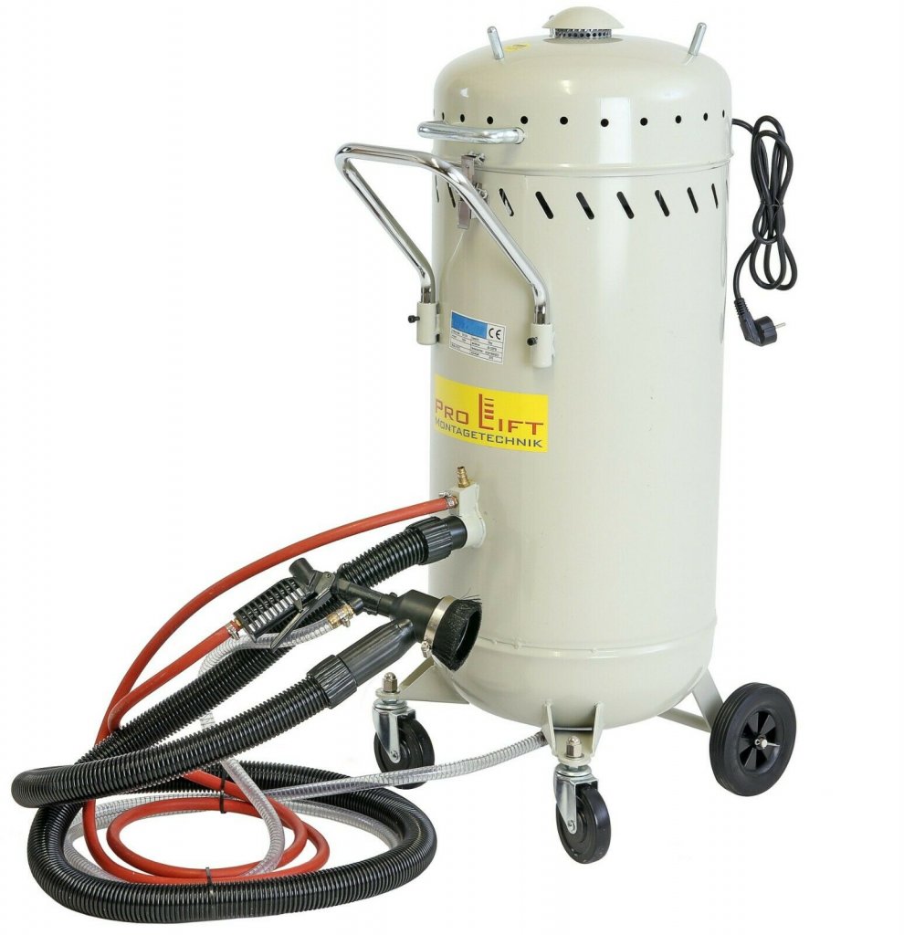 Den robusta tanken i ultramarinblå lackering och de fyra gummihjulen – två fasta och två styrbara – gör utrustningen lätt att manövrera även vid längre arbetsmoment. Perfekt för industri, bilrenovering, ytbehandling och verkstadsbruk där både effektivitet och renhet är prioriterat.