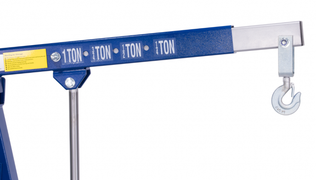 Kranens utdragbara stödarm kan justeras i fyra olika lägen – 1000 kg, 750 kg, 500 kg och 250 kg – vilket ger optimal anpassning för olika lyftscenarier. Med den integrerade säkerhetsventilen för sänkning garanteras en kontrollerad och trygg sänkhastighet varje gång. Den roterande lastkroken gör det dessutom lätt att positionera lasten med precision.