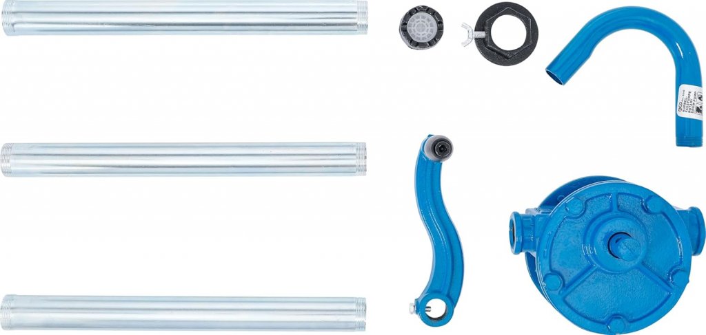 Pumpen är utrustad med en standardiserad fatadapter för enkel montering och ett robust 26 mm utloppsrör som ger jämnt flöde vid varje vevning. Med en kapacitet på upp till 278 cm³ per vevrotation får du en stabil och effektiv vätsketransport utan behov av el eller tryckluft.
