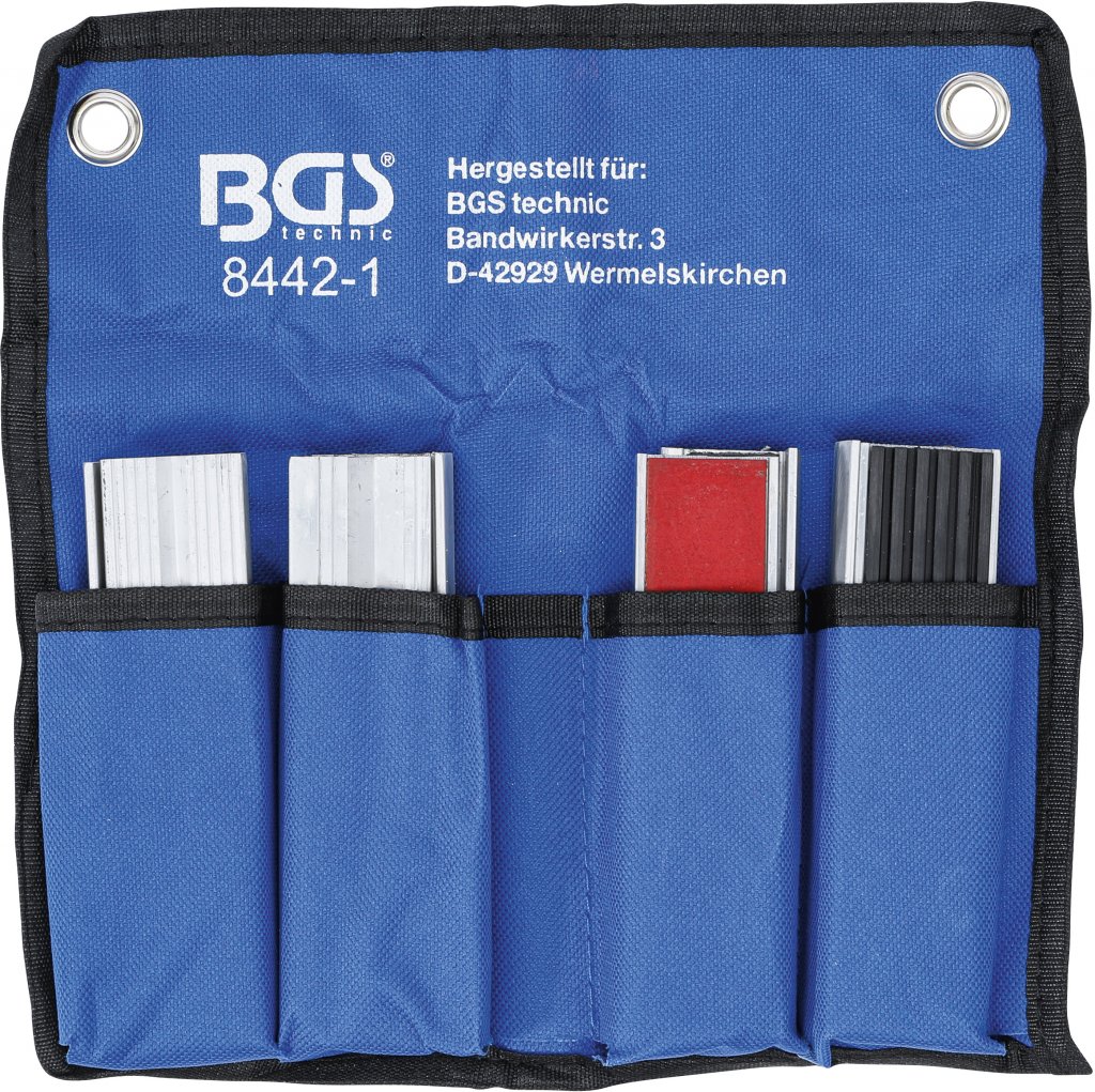 Satsen innehåller backar för olika typer av arbetsstycken: längsgående profiler för gängade stänger och bultar, tvärgående profiler för mångsidig fastspänning, backar med plasthölje för ömtåliga material samt backar med gummiplatta för mycket känsliga detaljer. Den praktiska verktygsväskan gör det enkelt att förvara och transportera satsen.